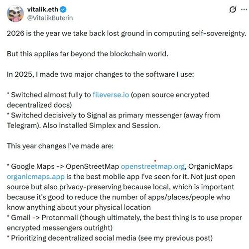 In his pursuit of self-sovereignty, Buterin has made the switch from Google Maps to OpenStreetMap via OrganicMaps and transitioned from Gmail to Proton Mail, all while emphasizing the importance of decentralized social media.