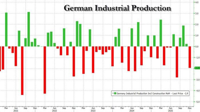 On the other hand, industrial production fell by 1.9% in December, slipping back into negative territory—a detail largely overlooked in the media’s positive coverage. The significant 6.3% decrease in orders for the once-dominant German automotive industry was also overshadowed amidst the general relief.