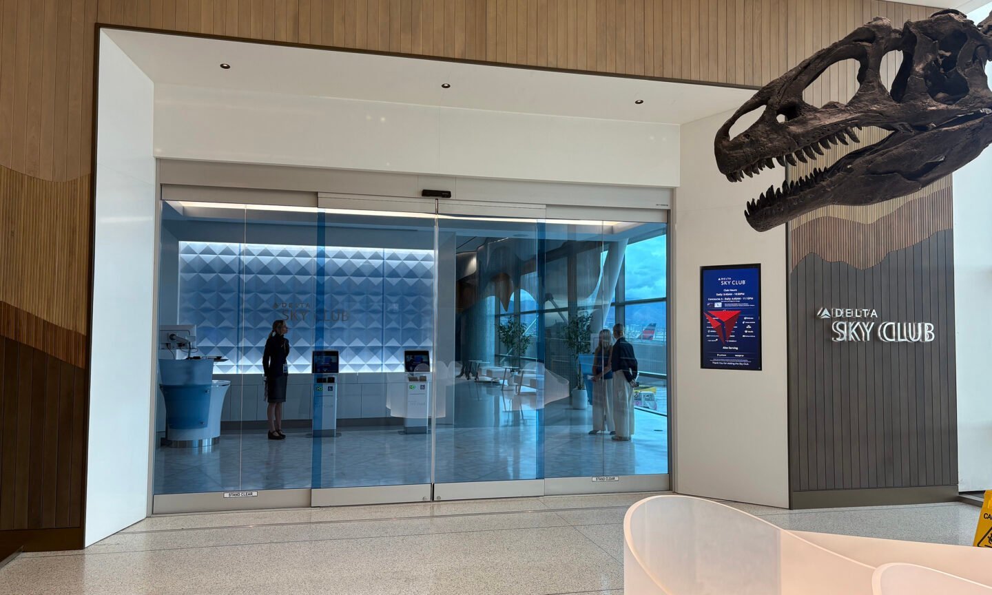 Upon entering Concourse B and coming up the escalator from the tunnel, visitors must make a U-turn to find the Delta Sky Club, situated to the left of the dinosaur fossil display.