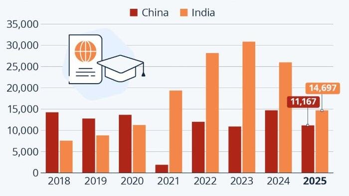 According to recent data, both India and China, the top two countries sending international students to the United States, experienced a decrease in the number of F-1 visas issued in the first half of 2025 compared to the same period in the previous year.