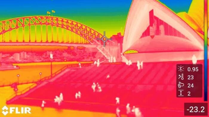 An infrared camera image by UNSW scientists captures the Sydney Opera House and Sydney Harbour Bridge emitting heat at night.